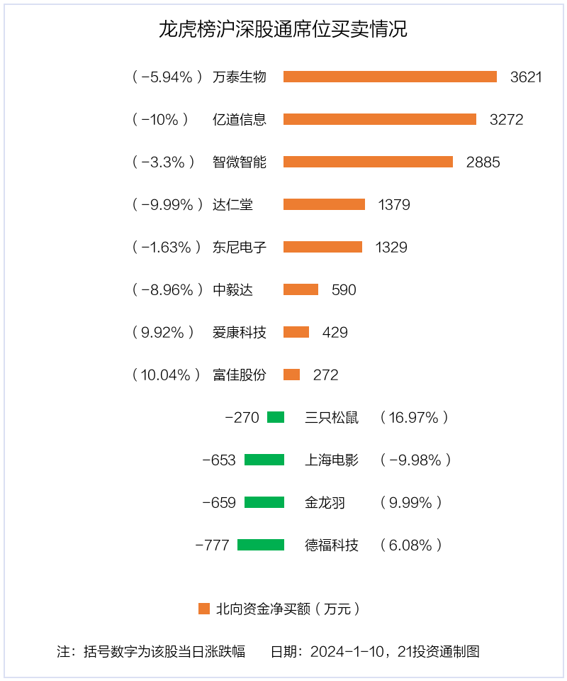1月10日,北向资金参与龙虎榜中的个股共有12只,合计净买入1.14亿元。其中沪股通净买入5 股,净卖出1 股,合计净买入6538.8万元;深股通净买入3 股,净卖出3 股,合计净买入4880.05万元。