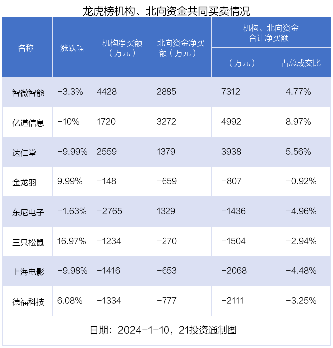 1月10日,23只个股龙虎榜出现了机构的身影,机构合计净卖出1.4亿元。具体来看,机构净买入7股,净卖出16股。